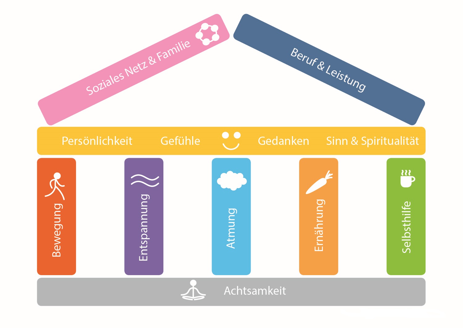 Das tragende Dach des Gesundheitstempels ist das Umfeld, bestehend aus sozialem Netzwerk, der Familie, dem Beruf und der Leistung (persönliche Ziele, Freizeitaktivitäten etc.). Auch meine eigene Persönlichkeit, meine Glaubenssätze und Muster, Gefühle und Gedanken und meine Sinnessuche gehören zur ganzheitlichen Gesundheit. Das Fundament für alles ist die Achtsamkeit – Mindfulness.